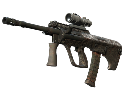 Powerful and accurate, the AUG scoped assault rifle compensates for its long reload times with low spread and a high rate of fire. It has been custom painted using dark fantasy and horror as inspiration.
