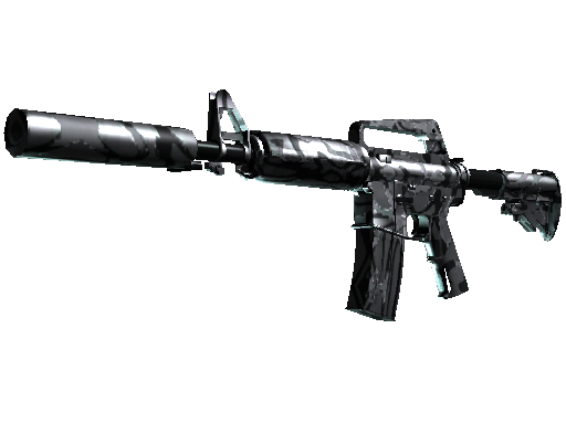 With a smaller magazine than its unmuffled counterpart, the silenced M4A1 provides quieter shots with less recoil and better accuracy. It has been painted in an aquatic-stripe pattern with charcoal metallic paints of various reflectivities over a chrome base coat.