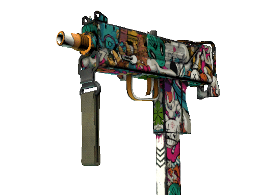 Essentially a box that bullets come out of, the MAC-10 SMG boasts a high rate of fire, with poor spread accuracy and high recoil as trade-offs. This custom paint job features brightly-colored drawings of chickens, aliens, defusers and more.